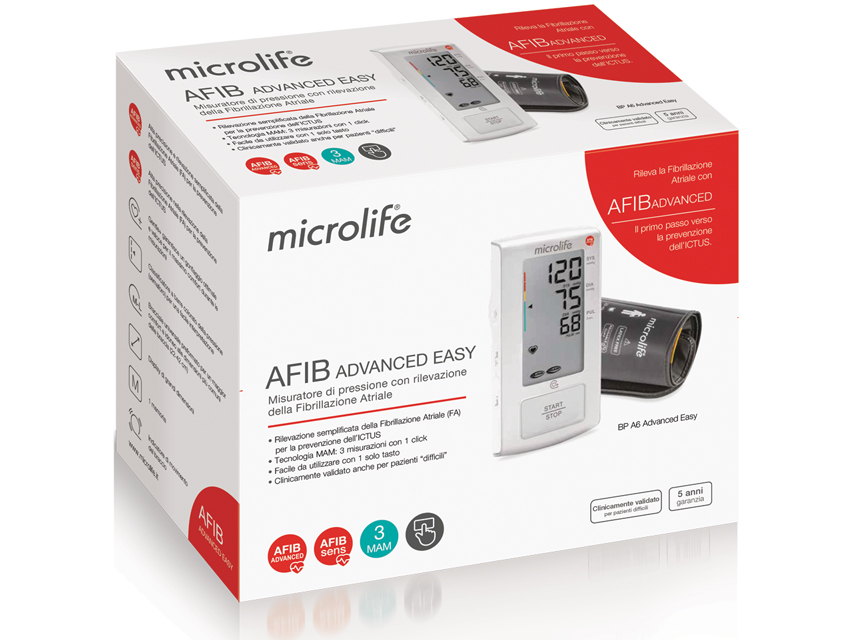 Digitālie, MICROLIFE AFIB ADVANCED EASY B.P.MONITOR - MICROLIFE AFIB ADVANCED EASY (mājai lietošanai).Priekškambaru fibrilācijas atklāšana (specifiska sirds aritmija) ar 1 mērījumu.Klīniski pārbaudīts saskaņā ar BHS - ISO - EHS protokoliem un piemērots īpašiem pacientiem, piemēram, diabētiķiem, gados veciem cilvēkiem, aptaukojušiem cilvēkiem, Hypothesis, grūtniecēm.MAM tehnoloģija (automātiska 3 secīgu mērījumu analīze).1 datu atmiņa.Satiksmes gaismas indikators.Zema baterijas līmeņa indikators.Tīkla adaptera ports.Pasaules jaunākās tehnoloģijas.Klīniski uzticami mērījumi ar AFIB un MAM.Speciāls deflācijas vārsts ļauj noteikt sitienus līdz 30 b/min (bradikardiskiem pacientiem).Piegādāts ar nēsāšanas somu, iepriekš formētu konisku manžeti 22-42 cm, 4 AAA baterijām 1.5V un lietotāja rokasgrāmatu (GB, FR, IT, DE).Mērījumu diapazons: 20-280 mmHg (spiediens), 30-200 beat/minute (pulss).Izmēri: 160x80x32 mm.Svars: 298 g ieskaitot baterijas.