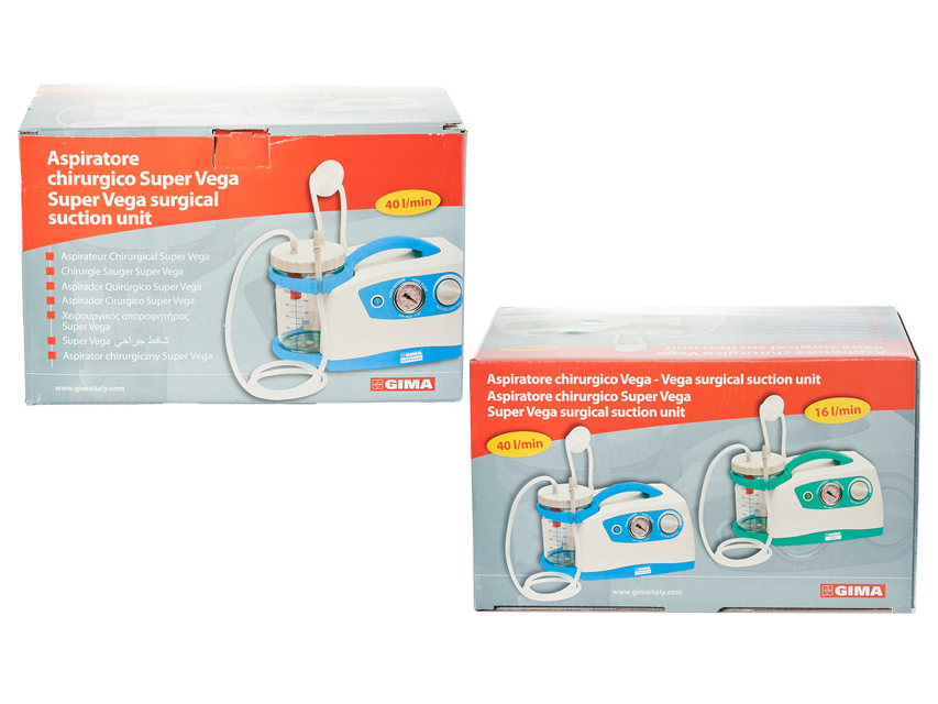 Super-Vega iesūkšanas aspirators, Supervega evo aspirators ar akumulatoru priekš ātrās palīdzības - Galda tipa aspirators ķermeņa, mutes dobuma, deguna un trahejas šķidrumiem pieaugušajiem un bērniem. Šaurā forma paredzēta ātrajai palīdzībai un izmantošanai ārkārtas situācijās. Lielais šķidro kristālu displejs atvieglo izmantošanu. Iekļauta litija baterija un iesūkšanas ātruma regulējums. Zems trokšņa līmenis. Piegādā ar atbalsta kronšteinu. Lietošanas instrukcija vairākās valodās: angļu, franču, spāņu, vācu, itāļu. Izgatavots Itālijā. Tehniskie parametri. • Dzinējs bez eļļas un virzuļa sūknis, kuram nav nepieciešama apkope. • Iekšējais akumulators (14.8V - 5.2A) - darbošanās laiks 70 min. • Adapters ātrās palīdzības mašīnai (12 - 4A). • Maksimālais vakuums: -0,75 бар, -75 КПа, -563 мм dzīvsudraba stabiņa. • Maksimālais gaisa patēriņš: 26 l/m. • Izmērs: 35 х 21 х 18 сm. • Svars: 2,7 kg.