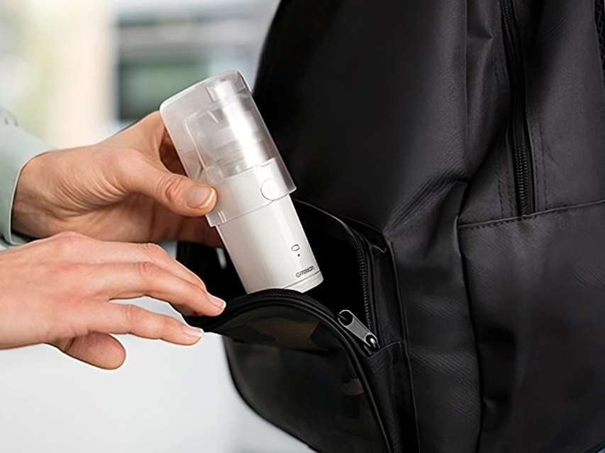 Nebulaizeris, Mesh smidzinātājs - Mazs, ērts, viegls smidzinātājs elpceļu slimību ārstēšanai, piemēram, akūtu iekaisumu, traheītu, bronhītu, pietūkumu un sāpēm kaklā. Var darboties ar 2xAA standarta baterijām vai USB kabeli. Maksimāli palielina zāļu priekšrocības. Pārnēsājams, rokas dizains (117 mm augstums). Īpaši zems trokšņa līmenis, īpaši viegls, tikai 104 g. Darbība ar vienu pogu ērtai lietošanai. Pieaugušajiem un bērniem: lietošana bez trokšņa un kompakts dizains ļauj veikt ieelpošanu pat tad, kad bērni guļ. Komplektā ar pieaugušo un bērnu masku, iemuti, 2xAA baterijas, USB kabelis, pārnēsāšanas soma, vairāku valodu rokasgrāmata un kaste (GB, IT, FR, ES, PT, DE). Barošanas avots: 2xAA baterijas vai USB kabelis DC 5V. Ultraskaņas frekvence: aptuveni 110kHz. Nebulizatora ātrums: =0.25ml/min. Maks. / min. šķidruma tilpums: 10 ml / 0,5 ml. MMAD aptuveni 4 µm. Smidzinātāja galviņas darbības laiks: 180 stundas. Akumulatora darbības laiks: 60 minūtes. Izslēgšanās: automātiska bez šķidruma. Drošības līmenis: tips BF, II klase, IP 22.