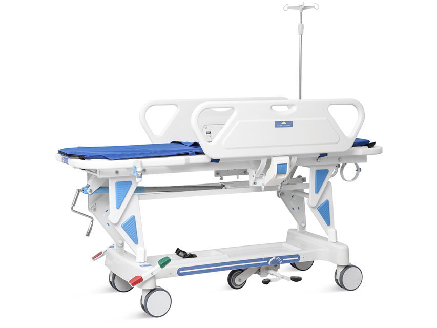 Transporta rati, Pacienta transporta rati ar regulējamu augstumu - AUGSTUMA REGULĒJAMA PACIENTU NESTUVE.Augstuma regulējama pacientu nestuve, izgatavota no metāla.Gan gultas rāmis, gan šasija ir izgatavoti no 30x50 mm kvadrātveida caurules, lai padarītu nestuves izturīgākas un stabilākas.Gultas platforma un margas ir izgatavotas no augstas kvalitātes PP materiāla.Atzveltne ar pacelšanas funkciju nodrošina pacientam lielāku komfortu.Nestuve ir aprīkota ar lentēm, lai novērstu pacientu iespējamu nobīdi no nestuvēm, un ar 2 cm biezu matraci.Nestuve ir aprīkota ar virziena riteni un centrālās bloķēšanas pedāļiem.Daudzvalodu rokasgrāmata: GB, FR, IT, ES, PT, DE, GR, RO.Centrālais virziena ritenis atvieglo virziena vadību.Četri dubultie sānu riteņi Ø 15 cm ir bloķējami ar pedāli.