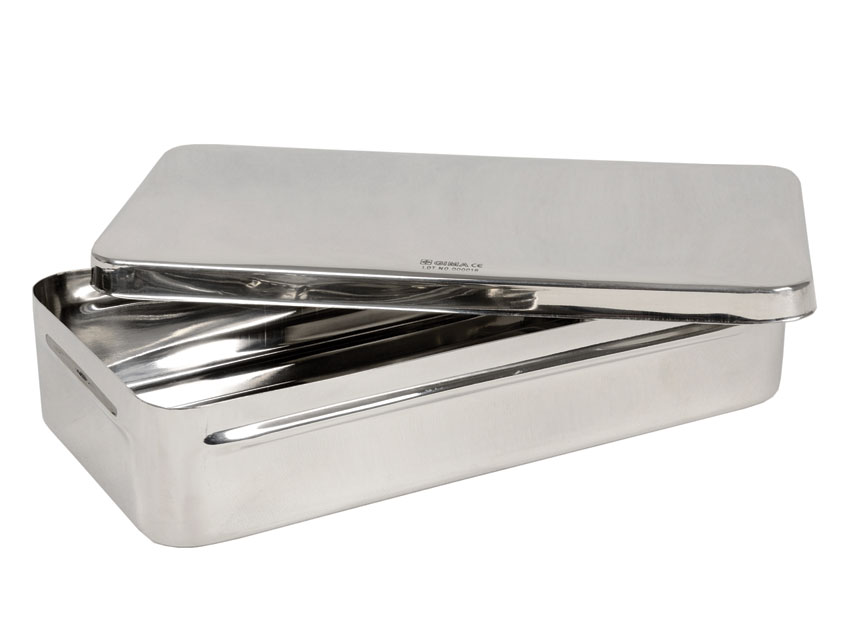 Instrumentu kastes ar vākiem bez rokturiem, Nerūsējošā tērauda kaste ar vāku bez roktura 18x8x4cm, autoklavējama 125 °C - Nerūsējošā tērauda instrumentu kaste bez rokturiem - autoklāvējama pie 125°C