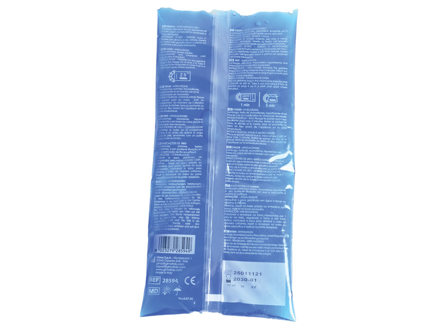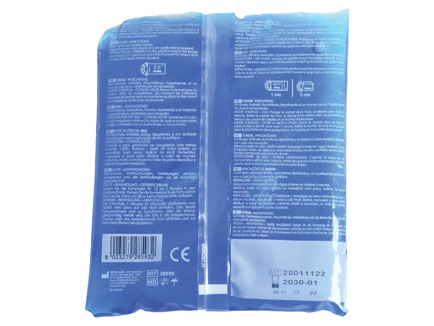 Aukstuma-karstuma pakete, KARSTS-AUKSTS THERMY GĒLS 11x26 cm - HOT-COLD THERMY GEL 11x26 cm - kaste ar 25 gab. Netoksisks un atkārtoti lietojams karsts/auksts gels, piemērots medicīniskiem mērķiem. Šie gela iepakojumi ir droši izmantot mikroviļņu krāsnī un verdošā ūdenī, tāpēc tie ir ideāli piemēroti karstuma terapijai: lumbago, stīvuma, reimatisma, hipotermijas un citos gadījumos, kad nepieciešama karsta aplikācija. Ievietoti saldētavā, tie ir ideāli piemēroti aukstuma terapijai: hematomas, sastiepumi, traumas, hipertermija un visos gadījumos, kad nepieciešama aukstuma pielietošana. Var lietot ar vāciņu (28596), lai novērstu apdegumus. Daudzvalodu instrukcijas: GB*, FR*, IT*, ES*, PT*, DE*, PL, NL, CZ, DK, SE, FI, EE, LT, LV, SK, SI, RO, HU, HR, GR, BG, arābu valodā*.