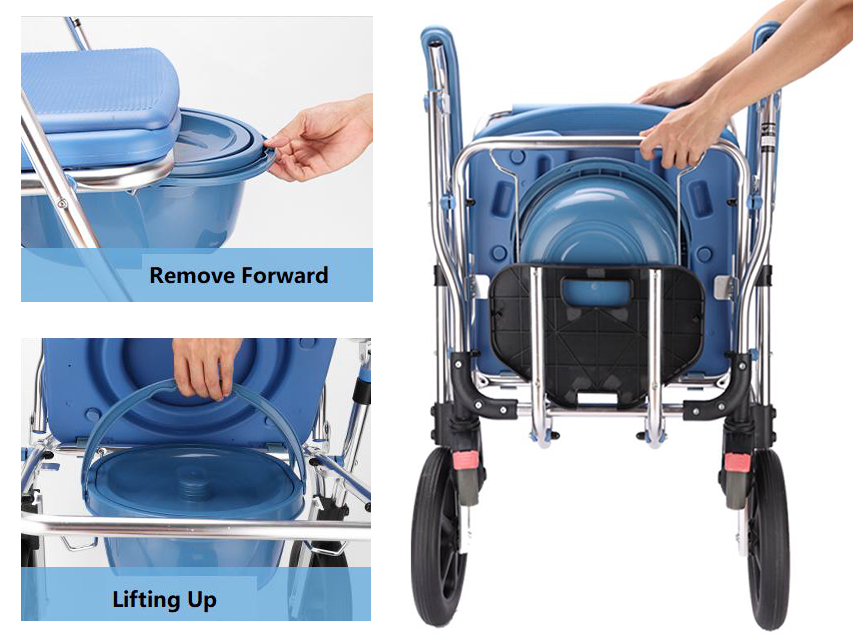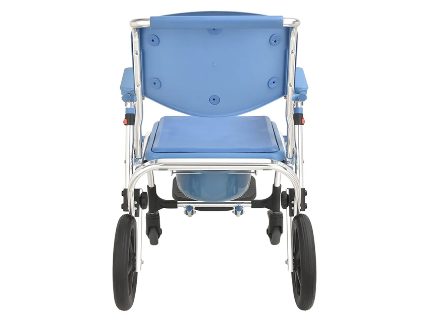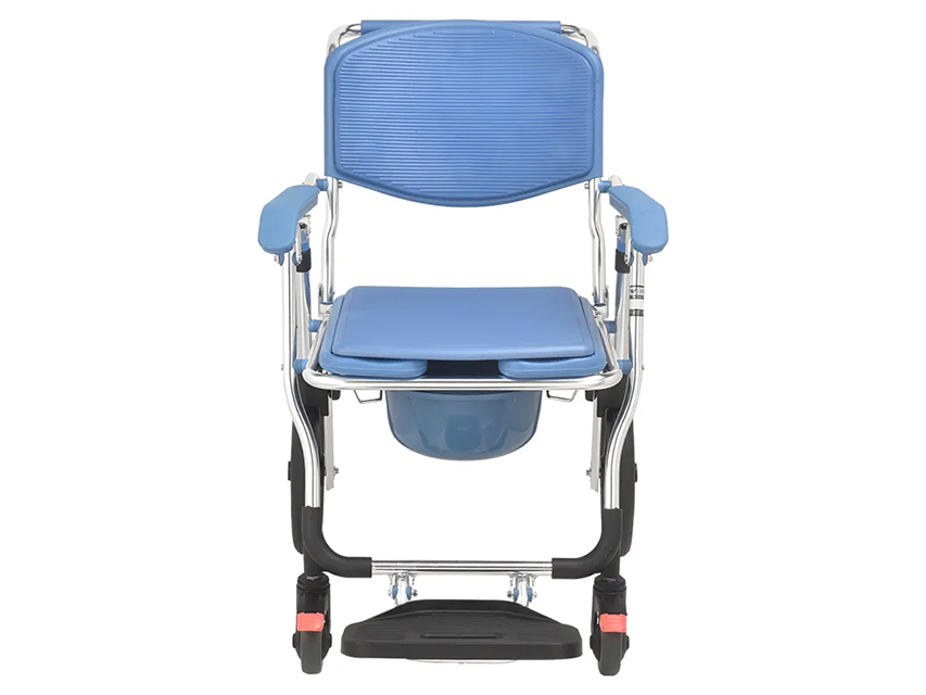 Ratiņkrēsli, Invalīdu krēsls ar riteņiem-rullīšiem no nerūsējošā tērauda - Rāmis no nerūsējošā tērauda, noņemami elkoņu un kāju turētāji, aizmugures riteņi ar bremzi, plastikāta kaste zem sēdekļa.