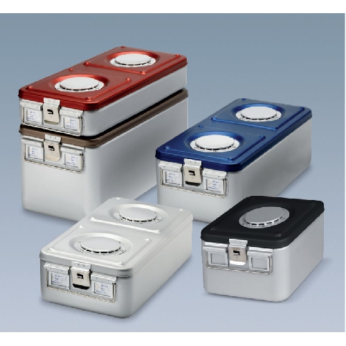 Sterilizācijas trauki, Alumīnija konteiners ar vienu vārstu - Alumīnija konteiners ar vienu vārstu piedāvā sistēmu, kas nodrošina mehānisku filtrēšanu. Šī sistēma darbojas vairākās fāzēs, kas atšķiras atkarībā no vārsta stāvokļa. Vārsts sākotnēji atrodas miera stāvoklī — pirms sterilizācijas sākuma. Sterilizācijas cikla vakuuma fāzē vārsts pilnībā atveras, ļaujot gaisam izplūst no konteinera. Pēc tam vārsts aizveras, bet pretvārsts atveras – šajā posmā tvertnē ieplūst tvaiks, un sākas sterilizācijas process. Cikla beigās vārsts hermētiski aizveras, tādējādi saglabājot konteinerā esošo saturu sterilu. Pilnībā izgatavots no alumīnija sakausējuma 5005, sienu biezums 2 mm. Korpuss un vāks ir presēti bez metinājuma šuvēm, kas nodrošina lielu izturību. Blīve nodrošina pilnīgu hermētiskumu, izgatavota no netoksiska silikona sūkļa, kas garantē maksimālu blīvumu. Slēdzene ar aizsardzības mehānismu pret nejaušu atvēršanu; paredzēta plombas piestiprināšanai. Etiķešu turētājs ērtai uzglabāšanai un klasificēšanai. Rokturi ērtai pārvietošanai. Anodēts pārklājums, pieejams dabīgā vai citās krāsās, 20 mikronu biezumā. Vāku krāsas: pelēka, melna, zila, sarkana, zaļa. Sakraušanas sistēma saderīga arī ar citu ražotāju konteineriem.