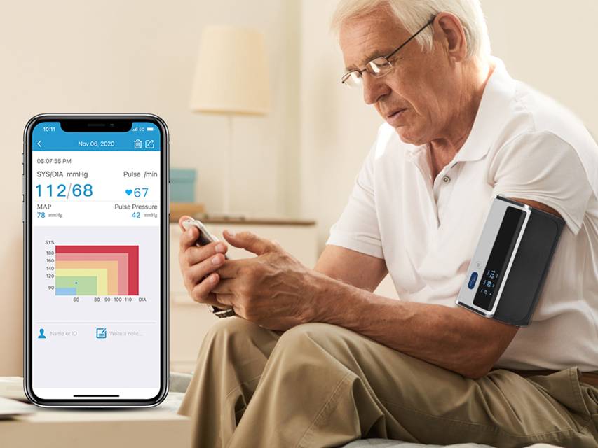 Klīniski apstiprināts asinsspiediena mērītājs, kas paredzēts ātrai un uzticamai nolasīšanai.