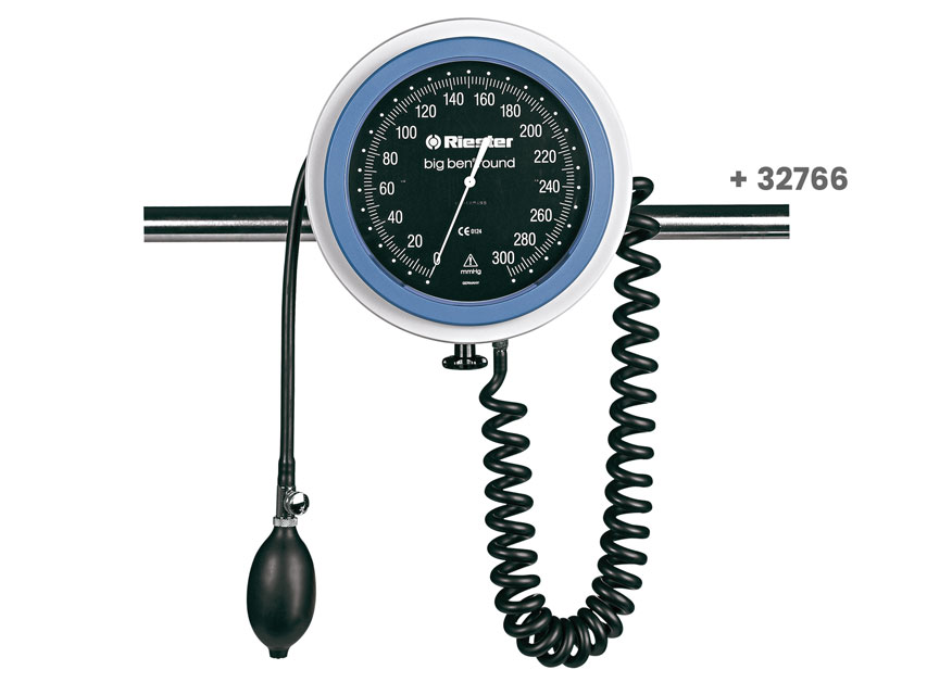 BIG BEN, BIG BEN asinsspiediena mērītājs - sliede - RIESTER BIG BEN® - sliede (skavas kods 32766, sliede nav iekļauta). Aneroīds asinsspiediena mērītājs, izgatavots no izturīgas plastmasas, ar lielu ciparnīcu (147 mm) un balto rādītāju uz melnas ciparnīcas plāksnes, nodrošinot viegli nolasāmus mērījumus no 0 mmHg līdz 300 mmHg. Groziņš aizmugurē manžetes uzglabāšanai pēc lietošanas. Melna manžete ar Velcro aizdari, ar 2 caurulēm un garu spirālveida šļauku. Bez lateksa. Ražots Vācijā.