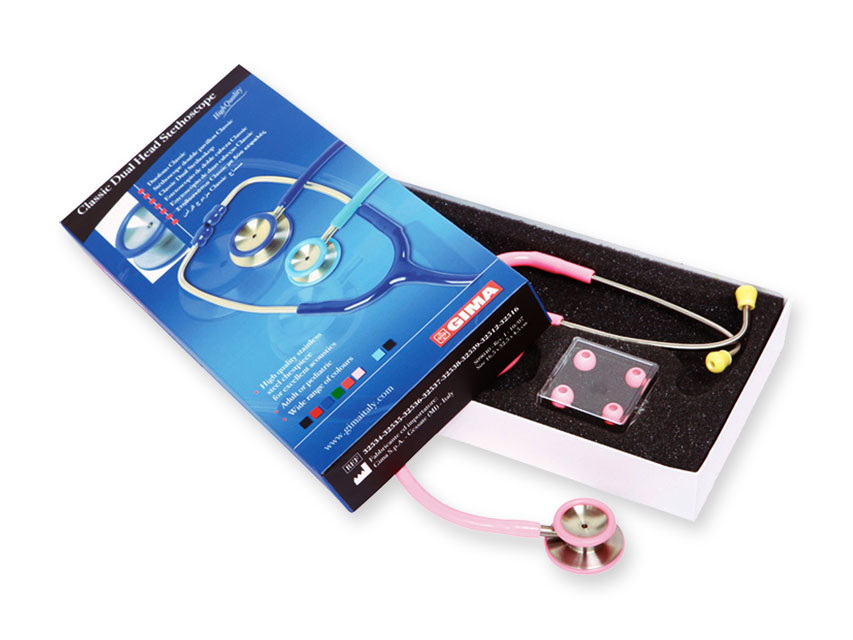 Krāsu saskaņota elastīgā 55 cm (22 collas) PVC Y caurule, neatvēsinošs gredzens un diafragmas fiksācijas gredzens nodrošina izcilu pacienta komfortu, vienlaikus piešķirot pievilcību. Tas tiek piegādāts putuplasta oderētā kastē ar 2 papildu mīksto ausu uzgaļu komplektiem. Krūšu