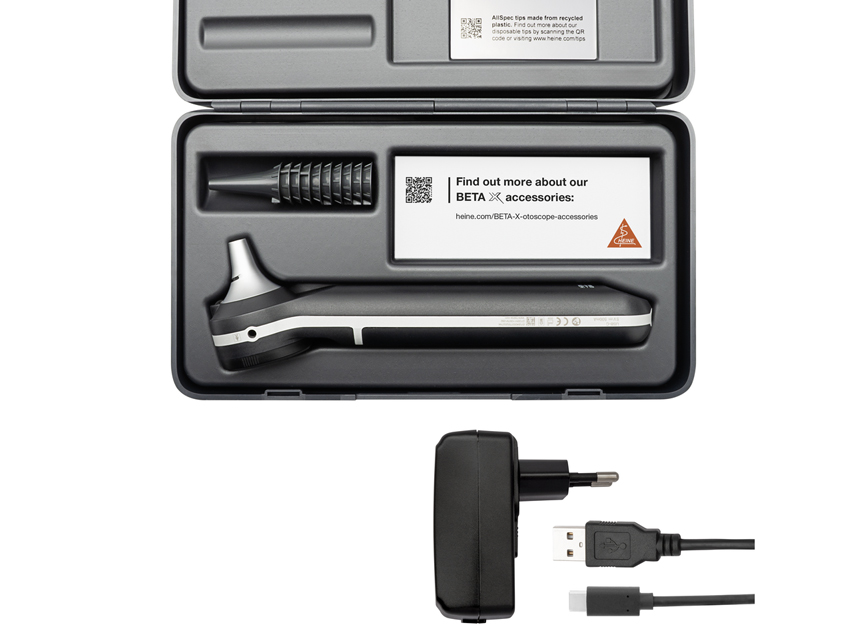 Dermatoskopi Heine, HEINE BETA X OTOSCOPE 3x - B-130.28.330 available September 2025 - HEINE BETA X OTOSCOPE 3x.B-130.28.330.HEINE BETA X otoskops ir paredzēts īslaicīgai auss, ārējā dzirdes kanāla un bungplēves apskatei.Pirmais otoskops ar papildus integrētu inSPECT izmeklēšanas gaismu un maināmiem optiskajiem moduļiem X CHANGE.Izturīgs, viegls un ergonomisks dizains.Augsta izšķirtspēja, precīza attēlojuma atveide un izsmalcināta apgaismošana ar LEDHQ.HEINE inSPECT integrētā izmeklēšanas gaisma nodrošina optimizētu apgaismojumu acu, deguna, mutes un rīkles nekontakta un neinvasīvām izmeklēšanām.Viegli pārslēgties no otoskopa uz izmeklēšanas gaismu, nospiežot pogu.HEINE X CHANGE sistēma ar maināmiem moduļiem.HEINE X CHANGE sistēma ļauj paplašināt BETA X otoskopa funkcionalitāti ar viegli maināmiem moduļiem.HEINE X CHANGE System 3x palielinātājs.HEINE X CHANGE System 4.2x palielinātājs (pēc izvēles).HEINE X CHANGE System Smartphone Adapter (pēc izvēles).HEINE LEDHQ un optisko šķiedru tehnoloģija optimālam apgaismojumam.Homogēns, ļoti spilgts apgaismojums ar naturālu krāsu atveidi, nodrošinot augstu kontrastu un ārkārtīgi detalizētu skata attēlojumu.Optisko šķiedru tehnoloģija nodrošina neskartu redzamību uz ausu kanāla un bungplēves.Paplašināts akumulatora darba laiks un LEDHQ praktiski neierobežots kalpošanas laiks.Piegādāts ar HEINE X CHANGE system 3x palielinātāju, 10 x AllSpec 4 mm vienreizlietojamiem uzgaļiem, USBC barošanas bloku, kasti un daudzvalodu rokasgrāmatu GB, FR, IT, ES, PT, DE, NL, SE, DK, NO, FI.HEINE X CHANGE System 3 x palielinātājs.Ideāla daudzpusīga palielinājuma opcija.Precīza optika ar daudzslāņu pārklājumu asiem attēliem.Ražots Vācijā.