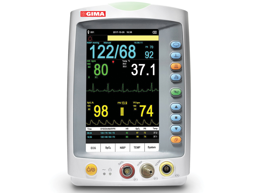 Pacientu monitorings, Gima vital plus monitors - Vital Signs ir nelielu daudzparametru pacientu monitoru sērija, kas paredzēta vitālo fizioloģisko parametru uzraudzībai: neinvazīvs asinsspiediens (NIBP), skābekļa piesātinājums (SpO₂), elektrokardiogramma (EKG) un temperatūra (TEMP).Īpašības.7” augstas izšķirtspējas skārienjūtīgs displejs.Vēsturisko datu apskate viļņveida attēlojumā, saraksta formā un tendenču grafikā.USB pieslēgvieta datu eksportēšanai un programmatūras atjaunināšanai.Tehniskā specifikācija.NIBP.Mērīšanas metode: oscilometriskā.Mērīšanas režīmi: Manual (manuālais), Auto (automātiskais), STAT.Mērīšanas diapazons.Sistoliskais spiediens (SYS), mmHg.Pieaugušajiem 40–275.Bērniem 40–200.Jaundzimušajiem 40–135.Vidējais arteriālais spiediens (MAP), mmHg.Pieaugušajiem 20–230.Bērniem 20–165.Jaundzimušajiem 20–110.Diastoliskais spiediens (DIA), mmHg.Pieaugušajiem 10–210.Bērniem 10–150.Jaundzimušajiem 10–95.SpO₂.Mērījumu diapazons: 35–100%.Precizitāte: ±3% diapazonā no 70% līdz 100%.Darbība pie zemas perfūzijas: līdz 0,4%.Pulss.Mērīšanas diapazons: 30–240 sit./min.Precizitāte: ±2 sit./min vai ±2% (ņem vērā lielāko vērtību).EKG.Sirdsdarbības frekvences displeja diapazons: 15–130 sit./min.Displeja precizitāte: ±1% vai ±2 sit./min (ņem vērā lielāko vērtību).Trauksmes aizkaves laiks: ≤10 s.Jutības izvēle: x1/4, x1/2, x1, x2.Slaucīšanas ātrums: 25 mm/s.Temperatūra.Mērīšanas diapazons: 21–50 °C.Precizitāte: ±0,2 °C diapazonā 25–45 °C.Citas tehniskās specifikācijas.Barošana: 100–240 VAC, 50/60 Hz.Akumulators: 11,1 V, 4400 mAh (litija jonu).Standarta komplektācija.Pieaugušo SpO₂ zonde.NIBP manžete pieaugušajiem.Temperatūras zonde (ādas tipa).EKG kabelis + 10 EKG elektrodu komplekts.Litija uzlādējamais akumulators.Barošanas kabelis.Aizsargpārvalks pret putekļiem.