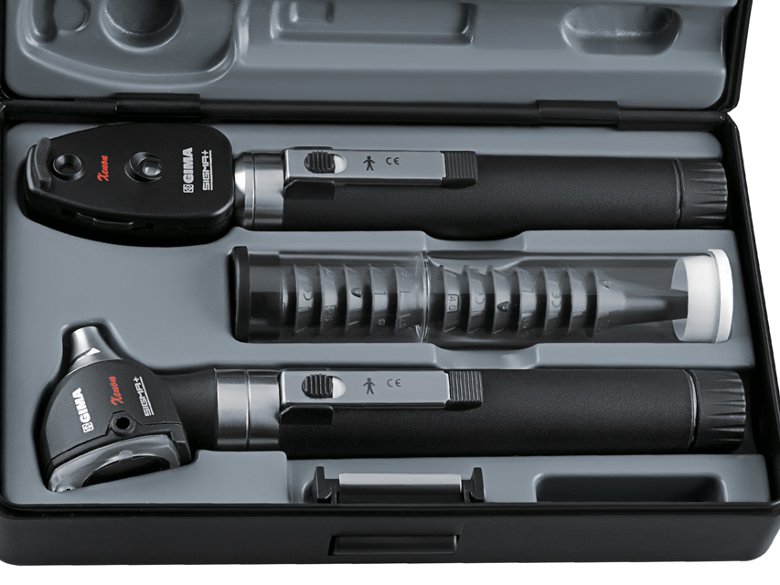 Oto- oftalmoskopi Sigma, Sigma F.O. LED oto-oftalmoskopa komplekts ar 2 uzlādējamiem rokturiem – futrālī - Oto-oftalmoskopa komplekts ar 2 atkārtoti uzlādējamiem rokturiem un baterijām. Tips: LED. Iepakojums: korpuss. Šis komplekts ir aprīkots ar oto- un oftalmoloģijas galviņu, 2 rokturiem, 14 vienreizlietojamiem spoguļiem (7 ar Ø 2,5 mm, 7 ar Ø 4 mm), 2 uzlādējamām baterijām.